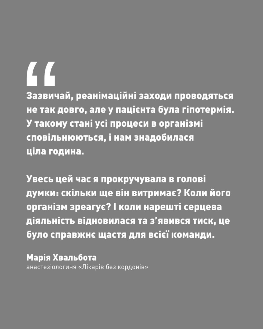 За рахунок порушеного кровопостачання страждає мозок, можуть з’явитися когнітивні порушення. На щастя, наш пацієнт цього уникнув. Коли він прокинувся, його зняли з апарату штучної вентиляції легень. Після огляду, пересвідчившись, що йому нічого не загрожує, його відпустили додому, – розказує анестезіологиня "Лікарів без кордонів" Марія Хвальбота.