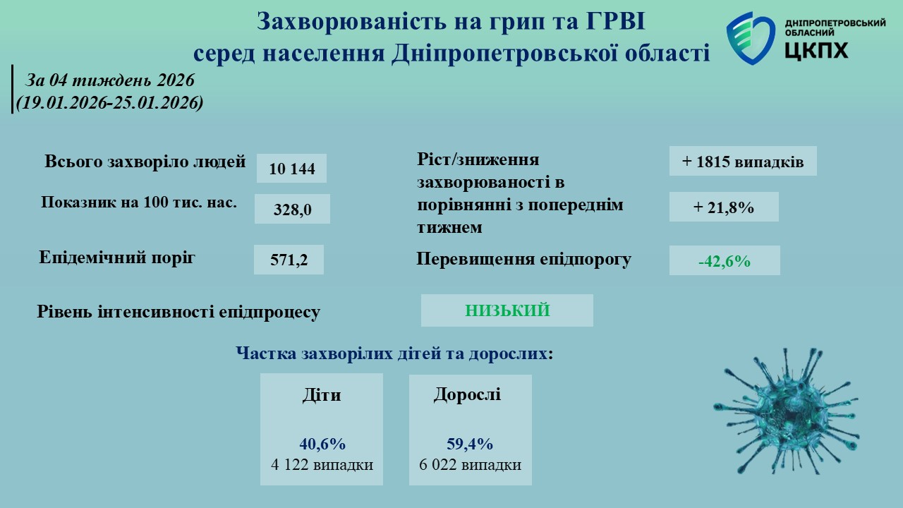 Епідемічна ситуація в Дніпропетровській області стає напруженішою. За даними ДУ "Дніпропетровський ОЦКПХ МОЗ", протягом четвертого тижня 2026 року кількість випадків ГРВІ та COVID-19 помітно збільшилася. Найтривожнішою подією тижня став летальний випадок, спричинений вірусом грипу А.
