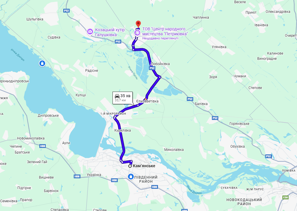 Із Кам’янського до Петриківки найзручніше їхати автомобілем — відстань становить близько 33 кілометрів, дорога займає приблизно годину. Необхідно дістатися лівобережної частини міста та рухатися автошляхом Т0414 у напрямку траси Р52.