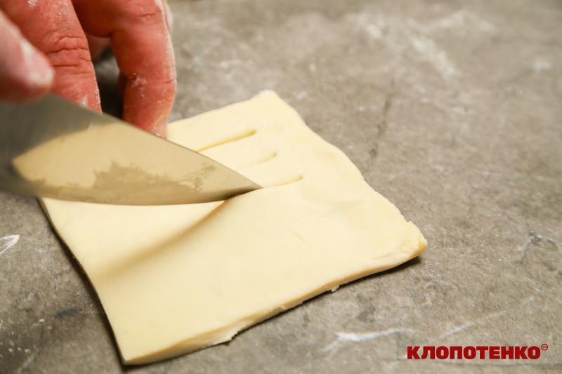 Розморожене тісто трішки розкачайте та наріжте на однакові квадрати. З одного краю квадратів зробіть ножем 4-5 невеликих розрізів, як на фото.