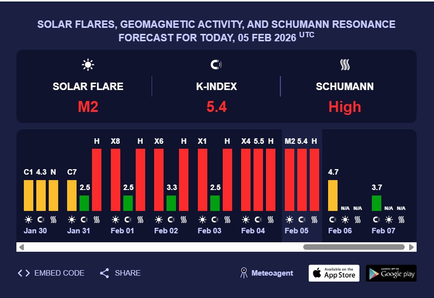 5 лютого (четвер): прогнозується сонячна активність із К-індексом 5,4 (червоний рівень), що відповідає сильній магнітній бурі.