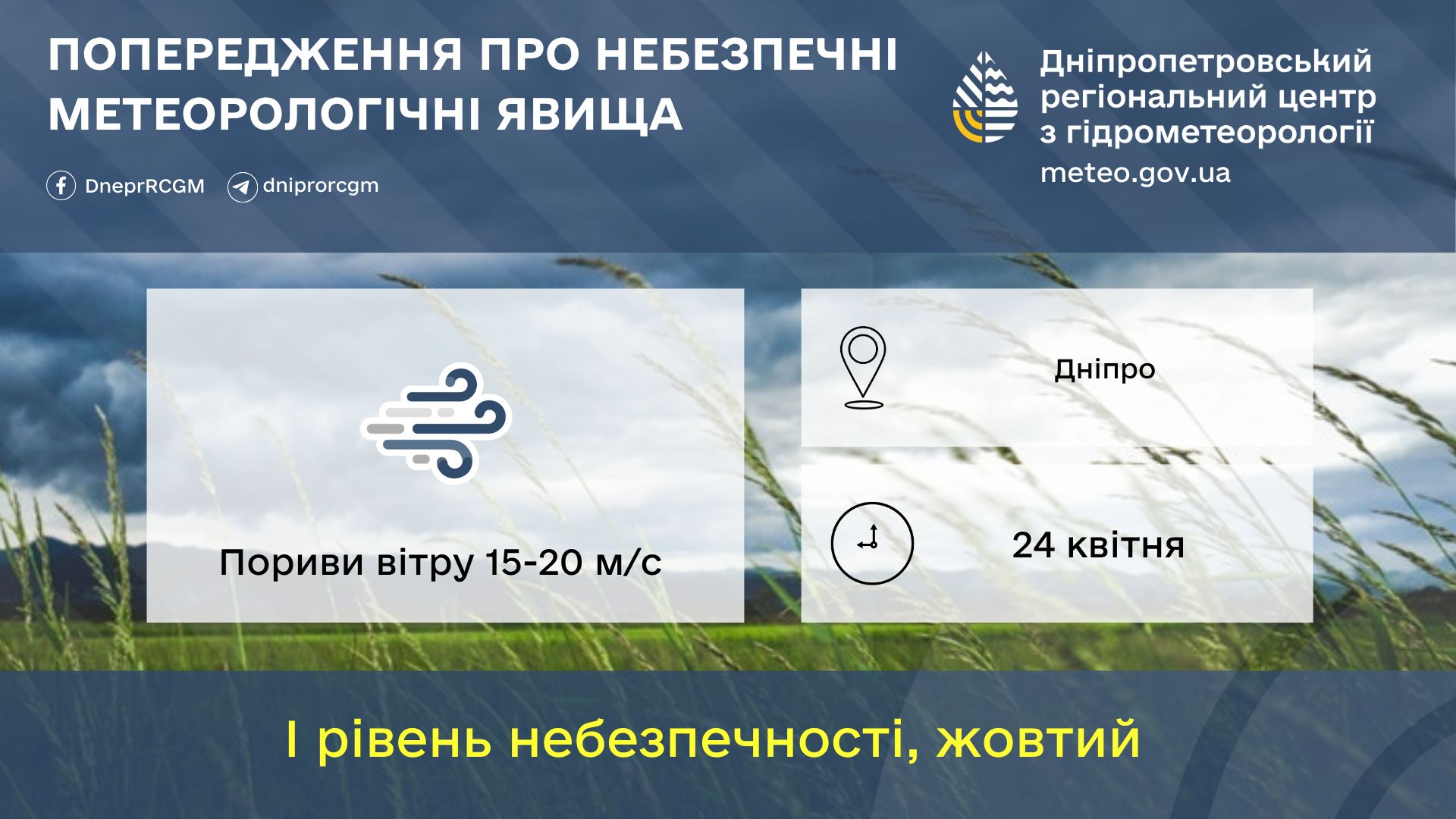 Дніпропетровський регіональний центр з гідрометеорології оприлюднив попередження про погіршення погодних умов у регіоні. На території області оголошено перший рівень небезпечності (жовтий) через пориви вітру та значне зниження температури у нічний час.