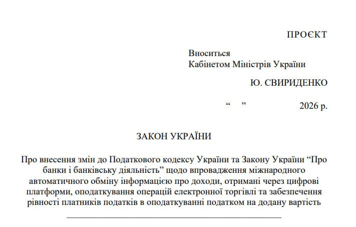 Міністерство фінансів України опублікувало текст нового "великого" податкового законопроєкту. Документ розроблено на виконання зобов’язань перед МВФ, а його головна мета — залучити до бюджету додаткові 60 мільярдів гривень на рік. Більшість норм мають набрати чинності з 1 січня 2027 року.