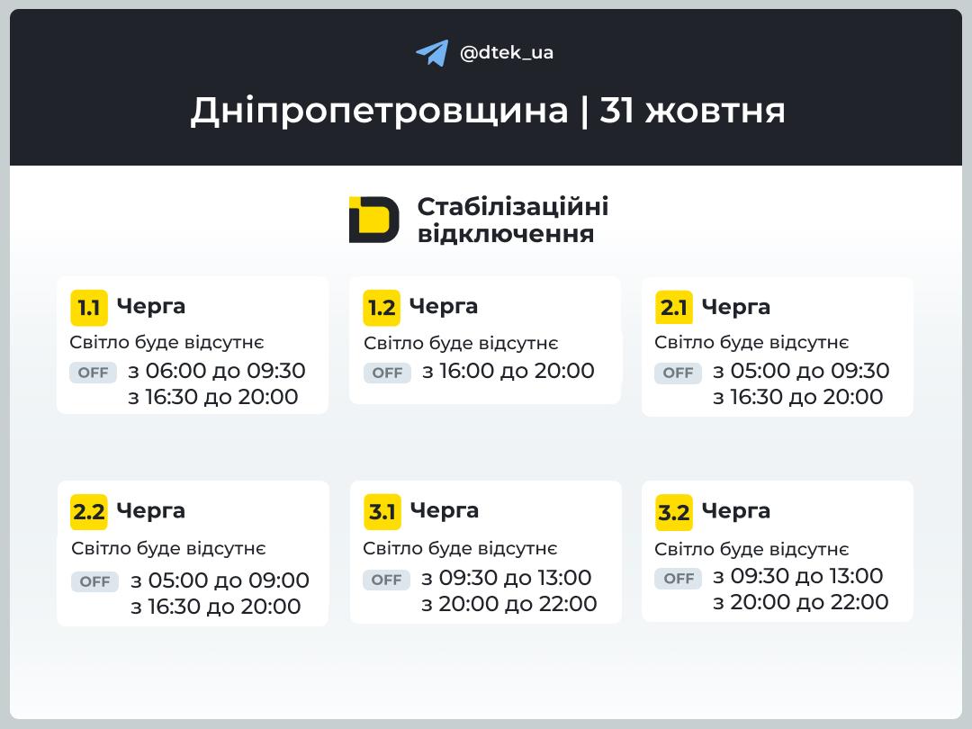 ДТЕК “Дніпровські електромережі” оприлюднив графіки стабілізаційних відключень світла у Кам’янському на 31 жовтня.