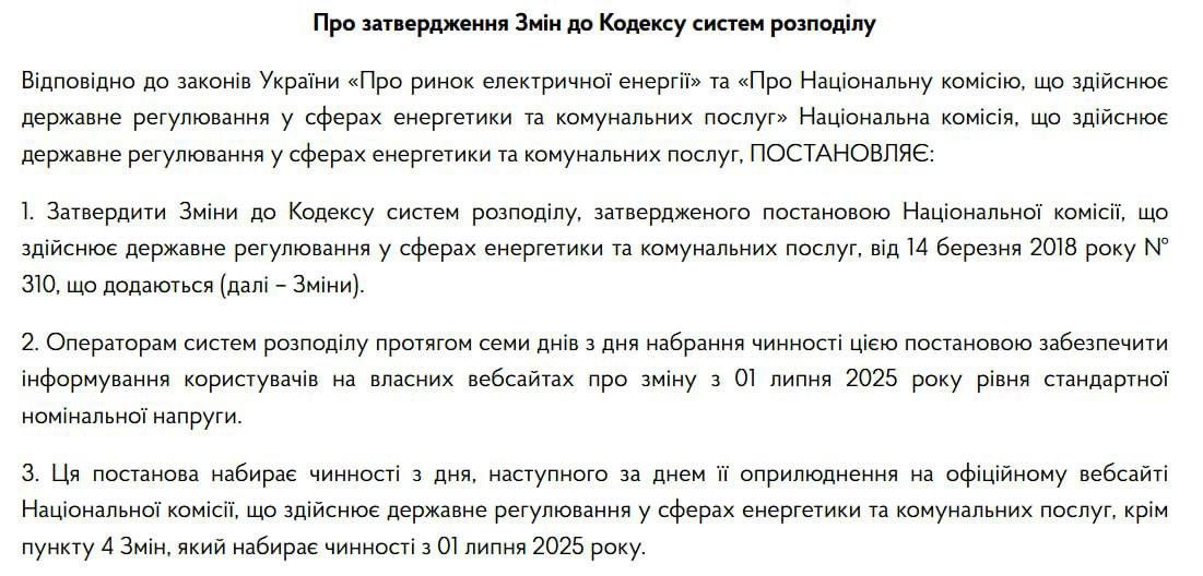 Допустиме відхилення напруги становитиме ±10%, тобто від 207 до 253 вольт. Стабільна напруга зменшить ризики пошкодження побутової техніки, чутливої до коливань.