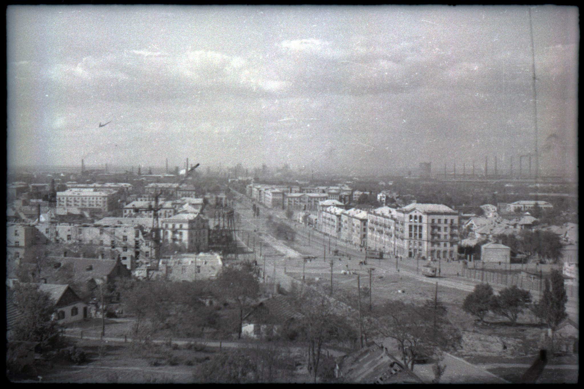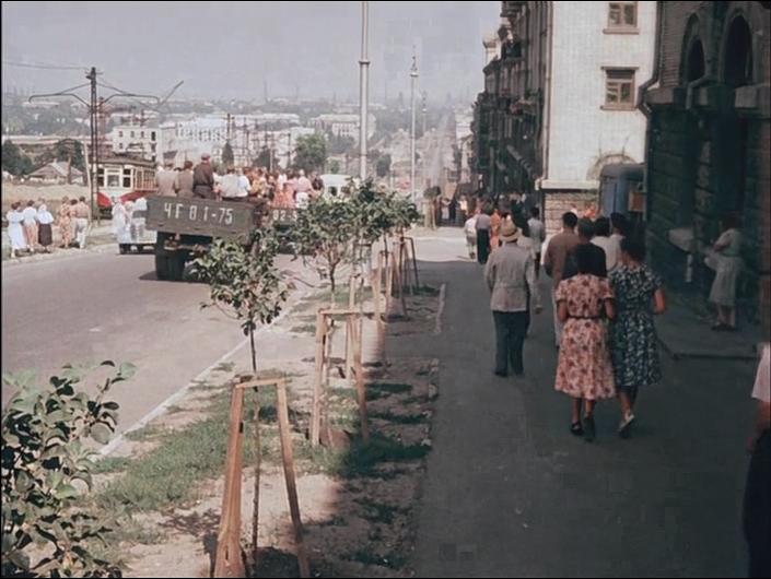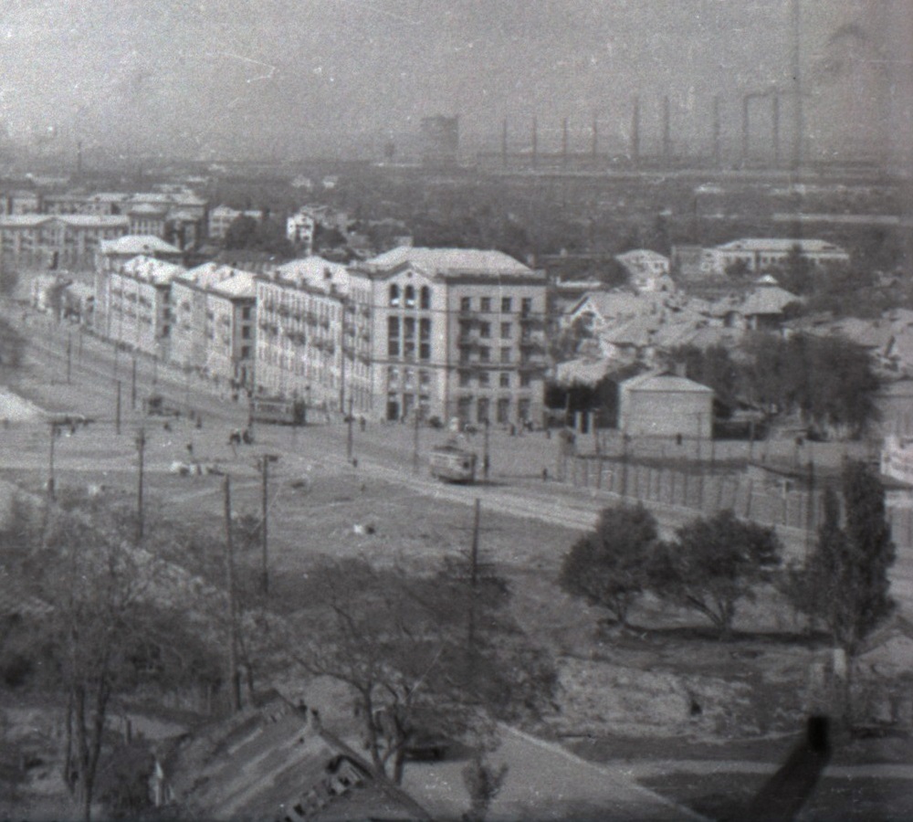 Біля правої межі кадру огороджено будмайданчик майбутнього будинку Придніпровського хімічного заводу, де потім розташується кафе "Аеліта". Повз нього прямує трамвай 2-го маршруту, прокладеного в 1937 році, а трохи нижче – повертає вагон 3-го маршруту, збудованого в 1953-му. На горизонті ж тут, поряд із гребінкою труб мартенівського цеху, височіють гігантський циліндр довоєнного газгольдера та водонапірна вежа, яка порівняно з ним видається мініатюрною.