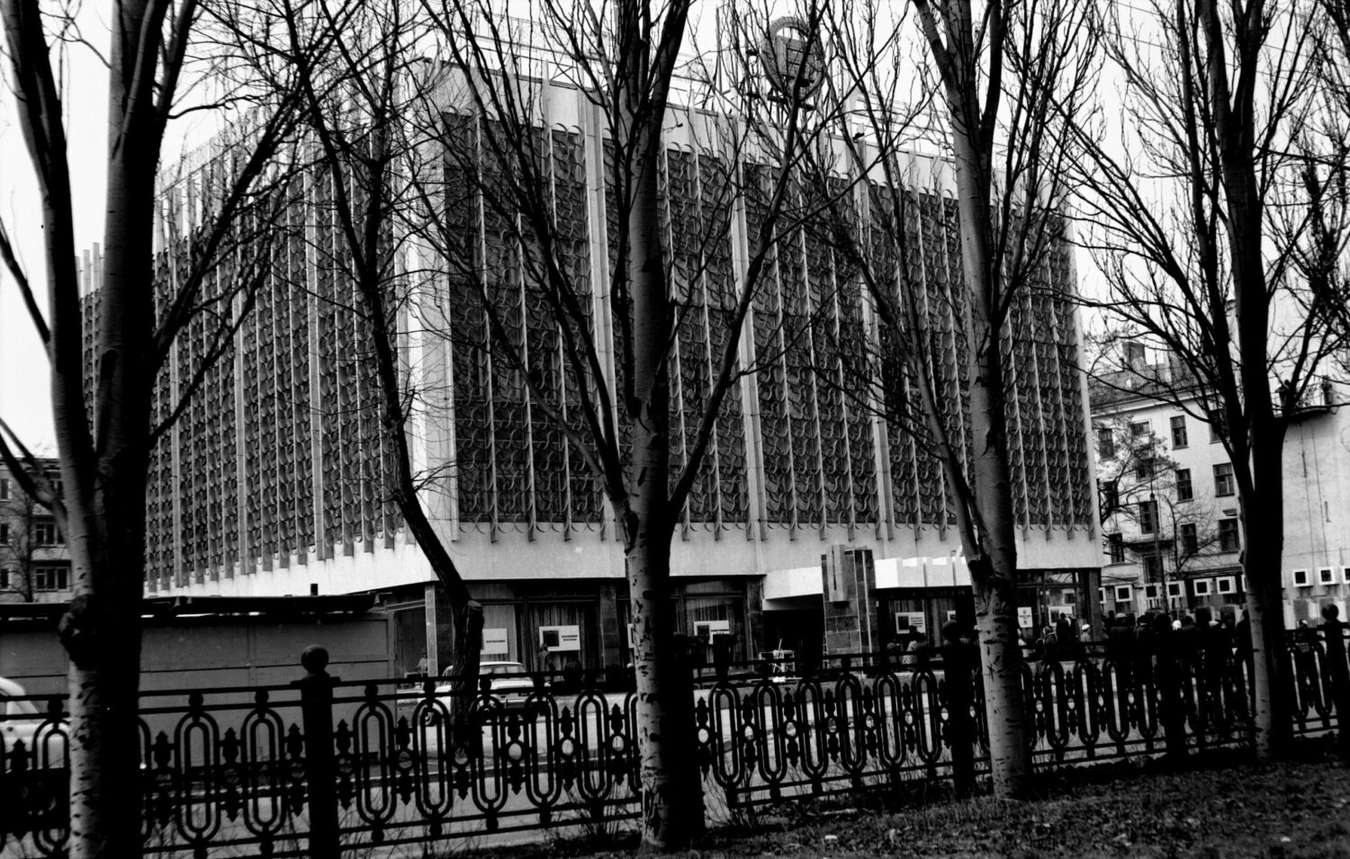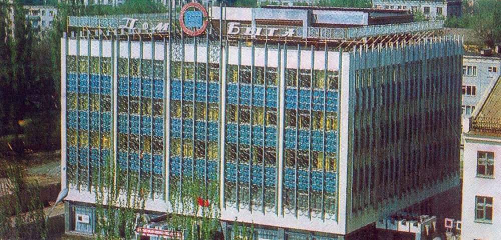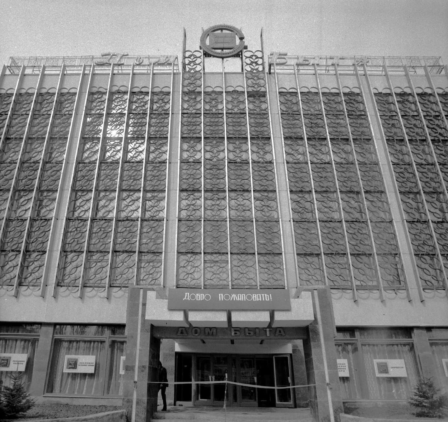 "Інтернаціональна" архітектура, зодягнена в алюмінієву кольчугу зверх бірюзового стемаліту, – так кількома словами можна було б описати зовнішність нового Будинку побуту, відкритого у центрі міста весною 1978 року. Як і сусідня, дещо пізніша багатоповерхівка з Будинком книги (1982), заклад побутового обслуговування виріс на місці довоєнних іще двоповерхових бараків, що колись займали велику частину цього кварталу.