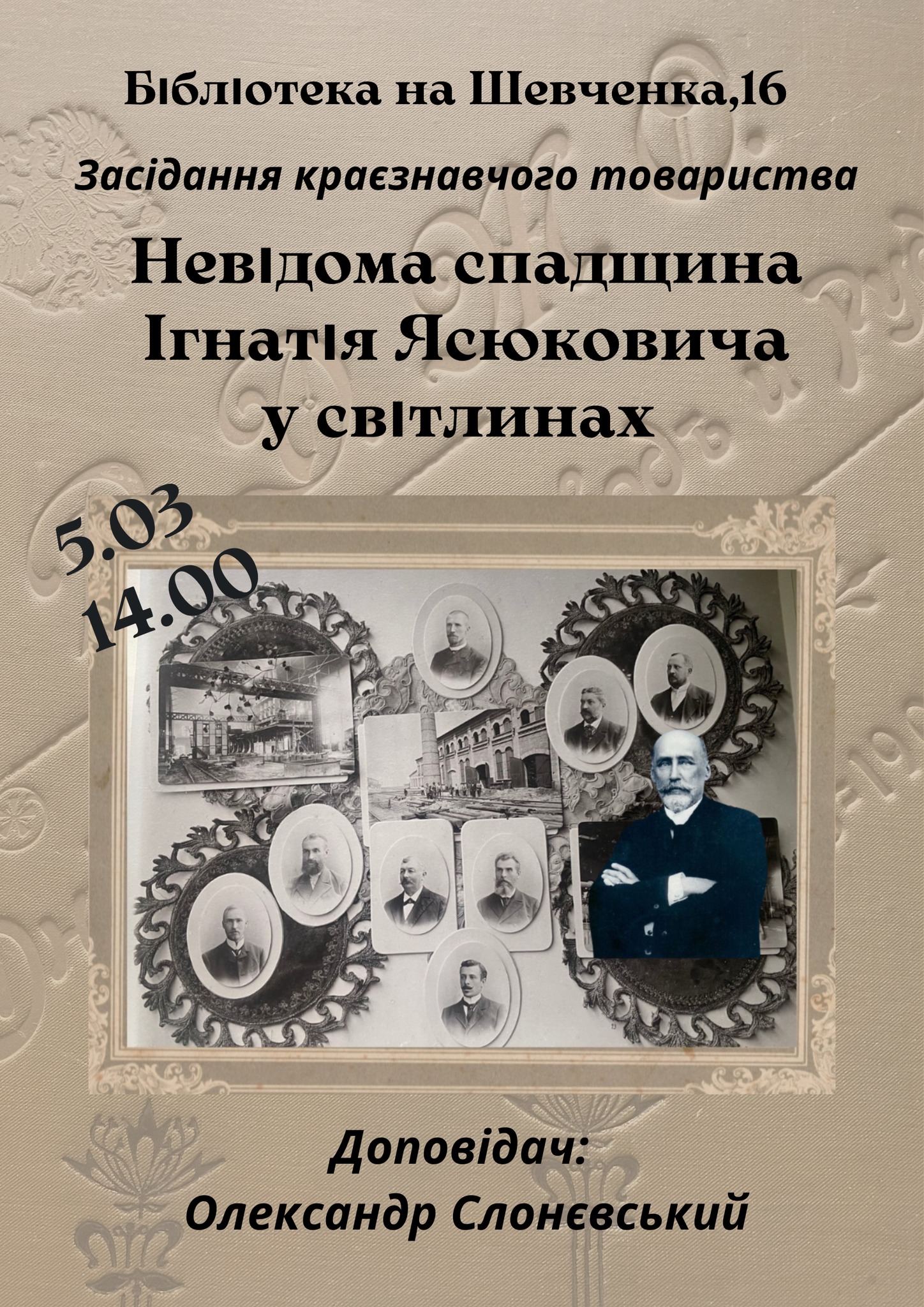 Тема майбутньої зустрічі — "Невідома спадщина Ігнатія Ясюковича у світлинах". Ігнатій Ясюкович є ключовою особистістю для Кам’янського, адже саме за часів його керівництва Дніпровським заводом наше місто пережило період стрімкого промислового та культурного розквіту. Цього разу акцент буде зроблено на візуальній історії: учасники матимуть змогу побачити унікальні фотографії та архівні матеріали, що зберігають пам’ять про життя міста на межі століть.