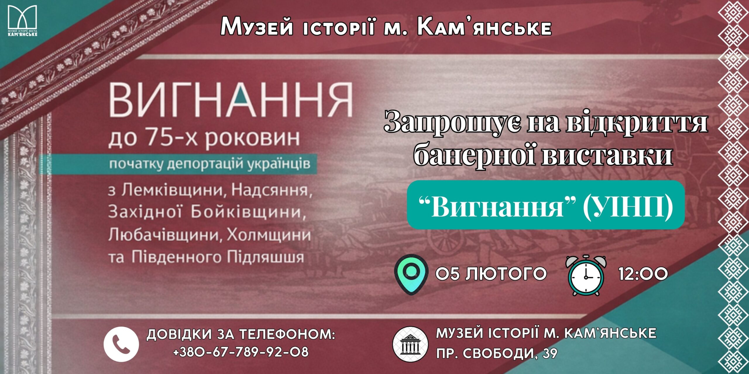 5 лютого о 12:00 у музеї історії міста Кам’янське відбудеться відкриття виставки "Вигнання". Як повідомляється на офіційній сторінці музею у фейсбуці, цей проєкт Українського інституту національної пам’яті присвячений трагічним сторінкам нашої історії, а саме: примусовим депортаціям українців у ХХ столітті. Експозиція охоплює події від операції "Вісла" до масових виселень із Криму та західних областей України.