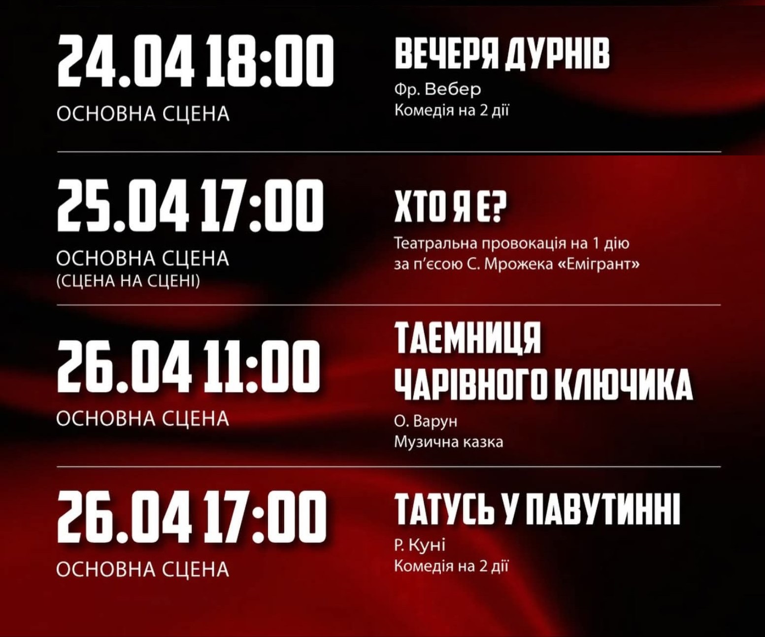 Вистави відбудуться на Основній сцені театру за адресою: площа 250-річчя міста, 2. Бронювання за телефоном: 067-49-67-281.