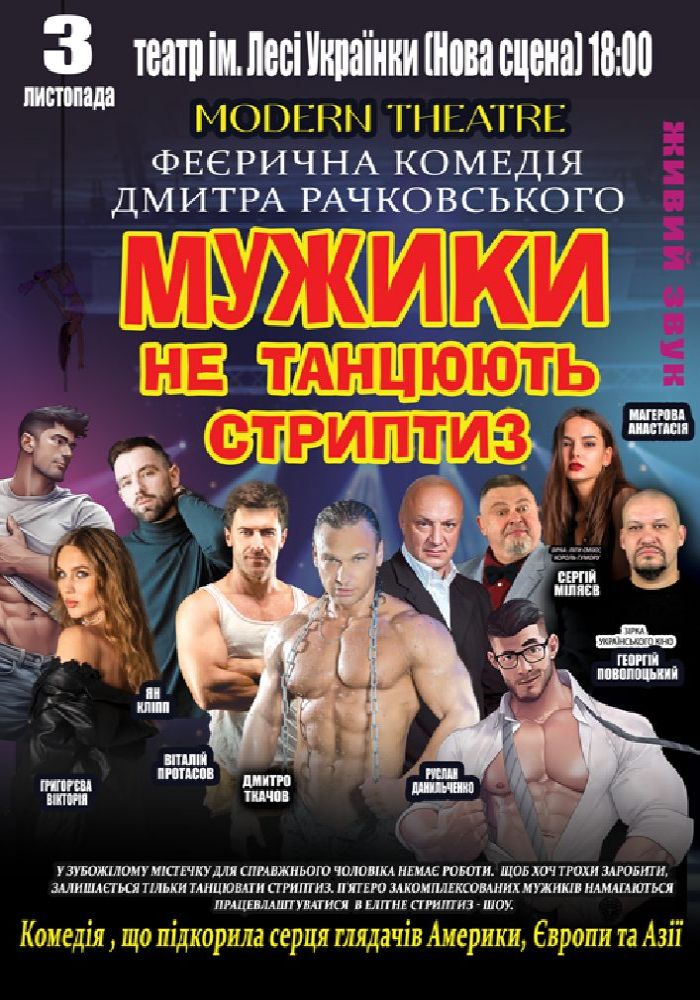 3 листопада 2025 року о 18:00 на Новій сцені Театру ім. Лесі Українки відбудеться показ гастрольної вистави "Мужики не танцюють стриптиз". Це епатажна, але водночас зворушлива комедія, яка вже завоювала серця тисяч глядачів по всій...