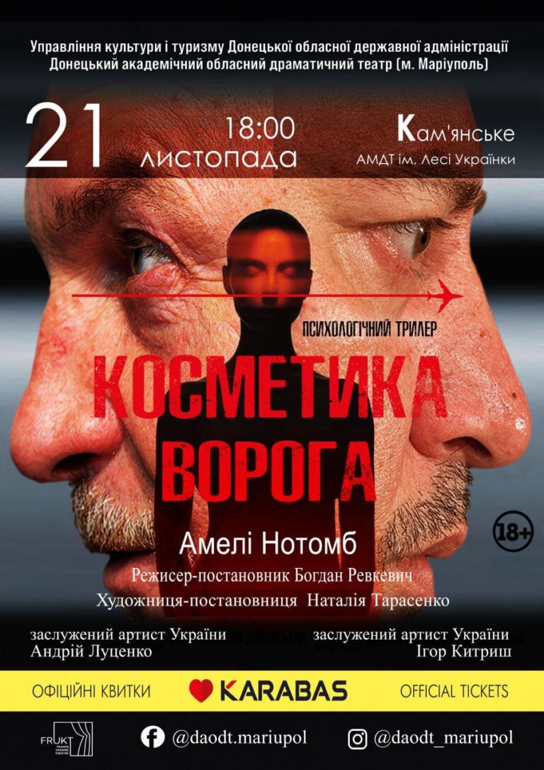 Кам’янське готується прийняти унікальну театральну подію. В рамках гастрольного туру Донецький академічний обласний драматичний театр (Маріуполь) покаже 21 листопада на Основній сцені Театру ім. Лесі Українки свою психологічно напружену виставу "Косметика ворога". Приїзд колективу, який...