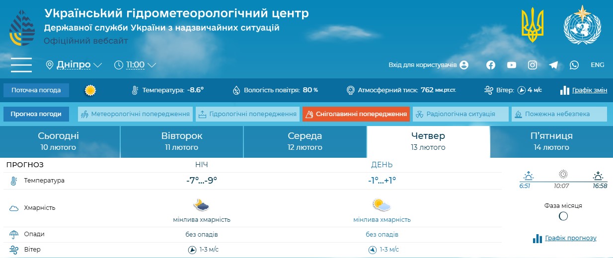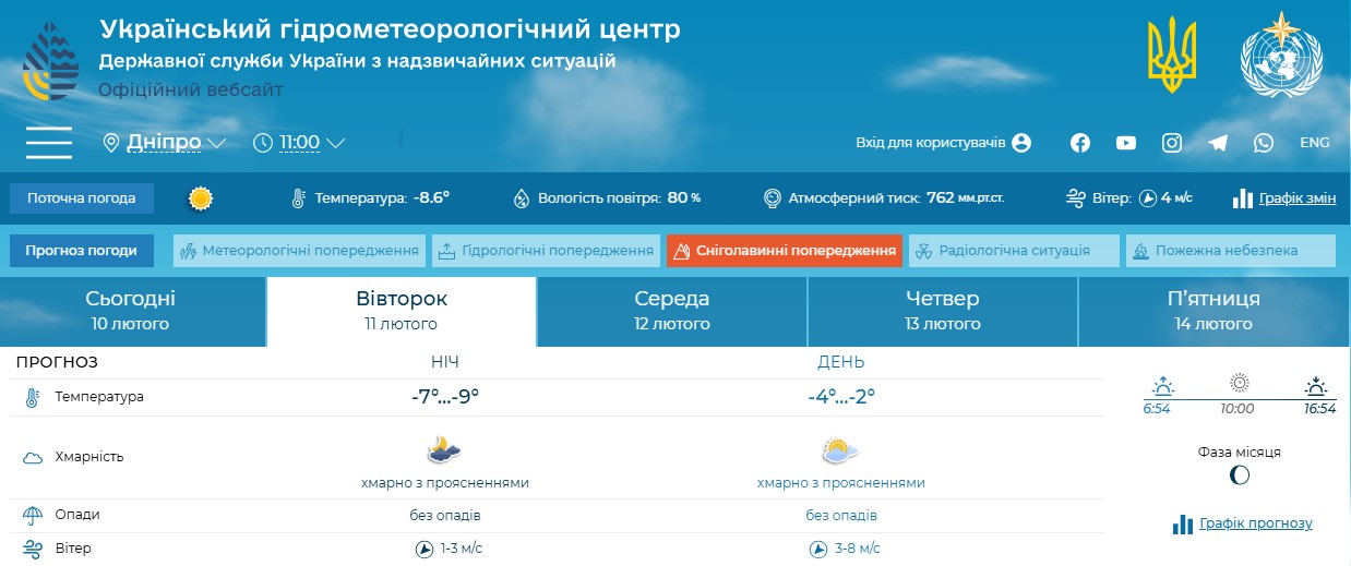 На 11 лютого в Укргідрометцентрі на Дніпропетровщині передають до – 9 градусів вночі, а вдень близько -2-4 градусів.