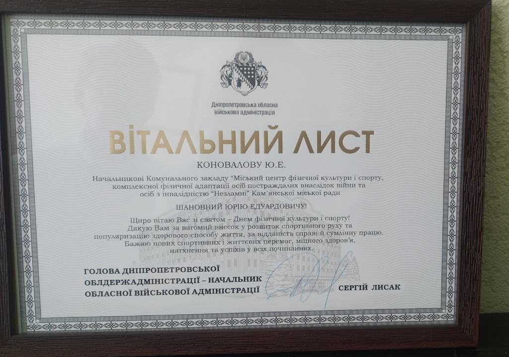 Приємно, що серед тих, хто особисто отримав з рук Сергія Лисака Вітальні листи з нагоди свята були і два представники Кам’янського. Це директор КЗ “Міський центр комплексної фізичної адаптації осіб постраждалих внаслідок війни та осіб з особливими потребами “Незламні” Юрій Коновалов та відомий у місті спортсмен і тренер армреслінгу, ветеран війни Едуард Аноткін, який має понад 25 років педагогічного досвіду.