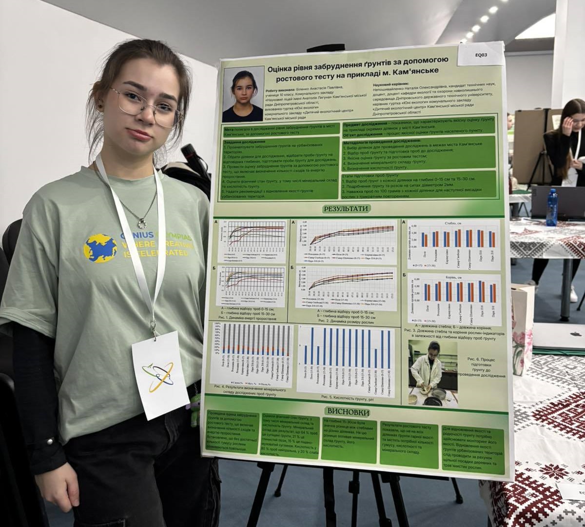 Проєкт Анастасії "Оцінка рівня забруднення ґрунтів за допомогою ростового тесту на прикладі міста Кам’янське" отримав високу оцінку професійного журі. Готувала юну науковицю до участі в Олімпіаді геніїв керівник гуртка "Юні екологи" Дитячого екологічного центру, доцентка кафедри екології та навколишнього середовища Дніпровського державного технічного університету Наталія Непошивайленко.
