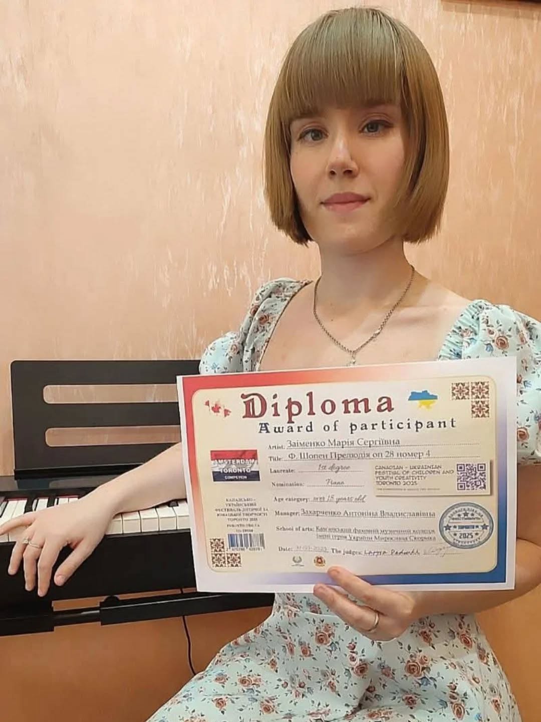 Студентка Кам’янського фахового музичного коледжу імені Героя України Мирослава Скорика, циклової комісії "Спів" Марія Заіменко (викладачка Антоніна Захарченко) отримала диплом лауреата І ступеня в номінації "Фортепіано".