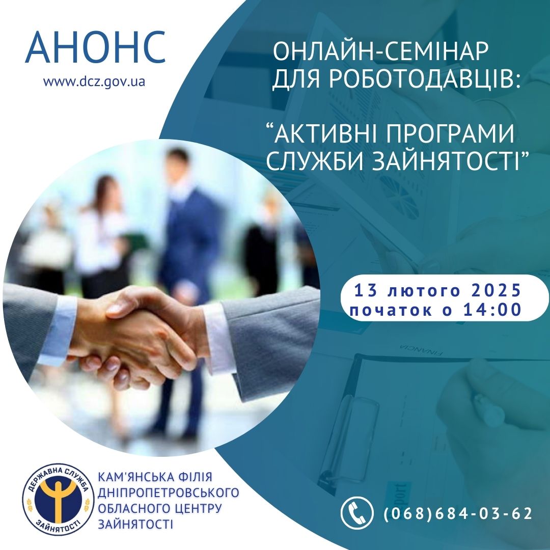 Фахівці Кам’янської філії Дніпропетровського обласного центру зайнятості запрошують роботодавців взяти участь в інформаційному онлайн-семінарі "Активні програми служби зайнятості", який відбудеться 13 лютого 2025 року.