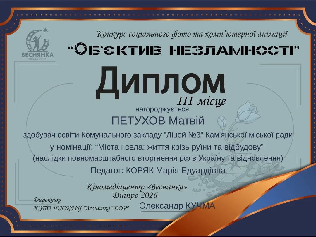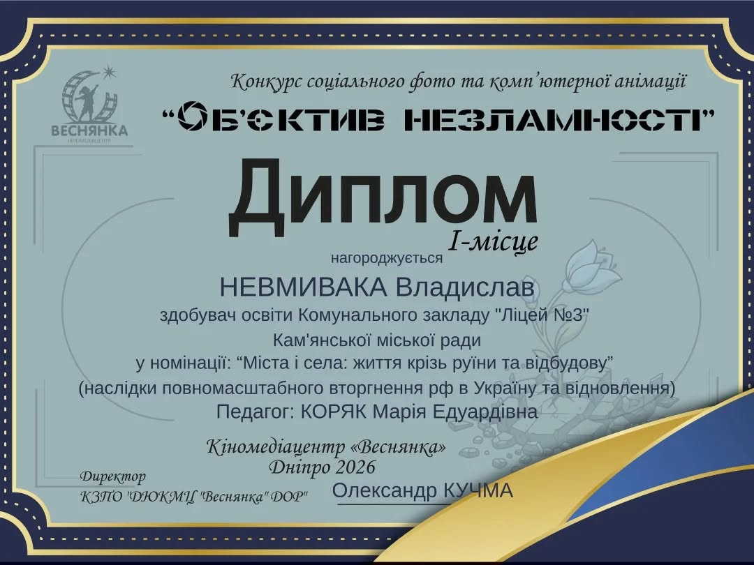 Вихованці Ліцею №3 стали призерами конкурсу соціального фото та комп’ютерної анімації "Об’єктив незламності", організованого кіномедіацентром "Веснянка". Під наставництвом педагогині Марії Едуардівни Коряк талановита молодь представила світлини, що вразили журі своєю глибиною та правдивістю.