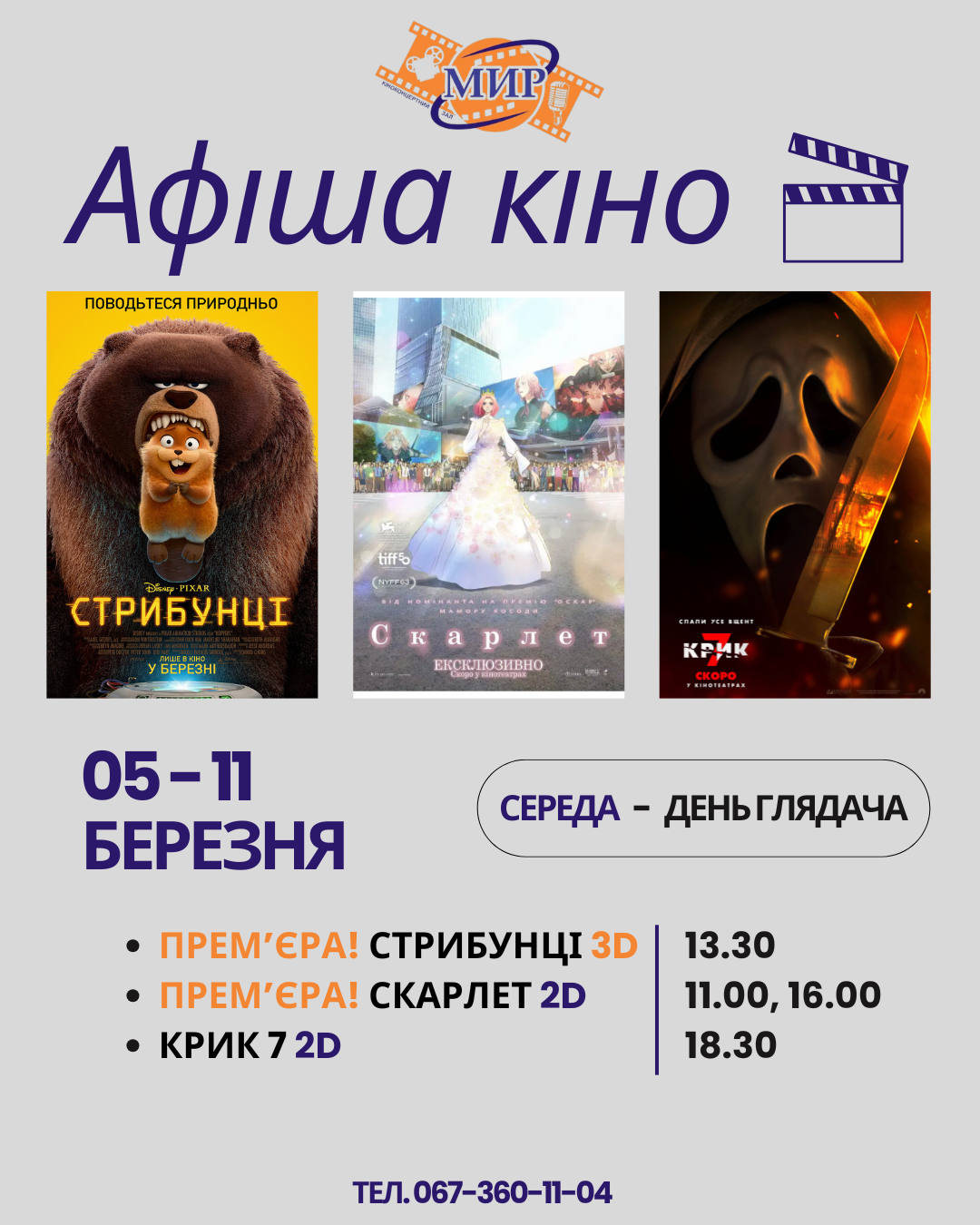 Розклад сеансів у Кіноконцертному залі "Мир" на 5 – 11 березня