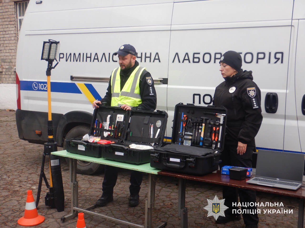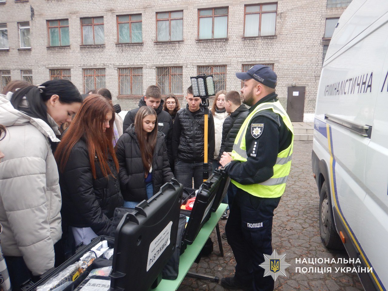 Також учням показали, як фахівці збирають і досліджують сліди, працюють із відбитками пальців, використовують спеціальні порошки, освітлювальні прилади та інші інструменти для фіксації доказів.