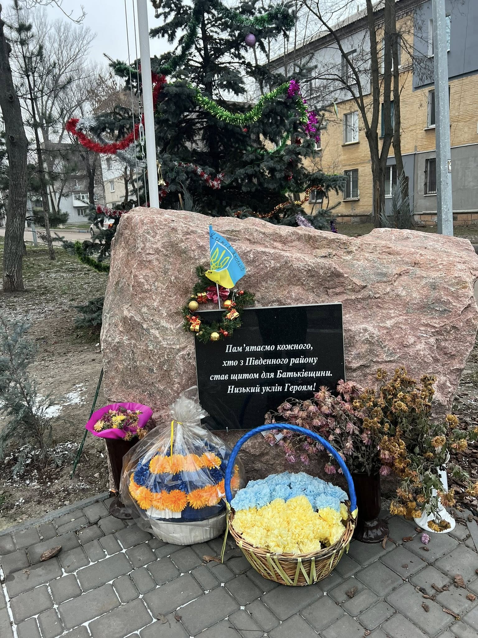 Активісти та мешканці Південного району реалізували громадську ініціативу з благоустрою меморіальної локації. Представники громадської організації "Голос" спільно з місцевою жителькою Людмилою Надворною вбрали ялинки у сквері, присвяченому захисникам України.