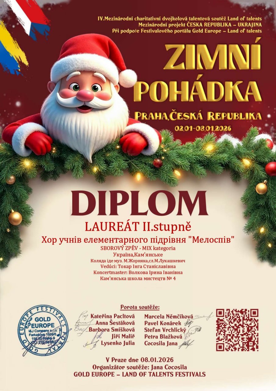 Юні таланти Кам’янського продовжують прославляти рідне місто на міжнародній арені. Хор учнів елементарного підрівня "Мелоспів" Кам’янської школи мистецтв № 4 гідно представив Україну на IV Міжнародному благодійному двотуровому конкурсі талантів "Zimní pohádka / Зимова казка", який проходив у столиці Чехії, місті Прага, з 2 по 8 січня 2026 року.