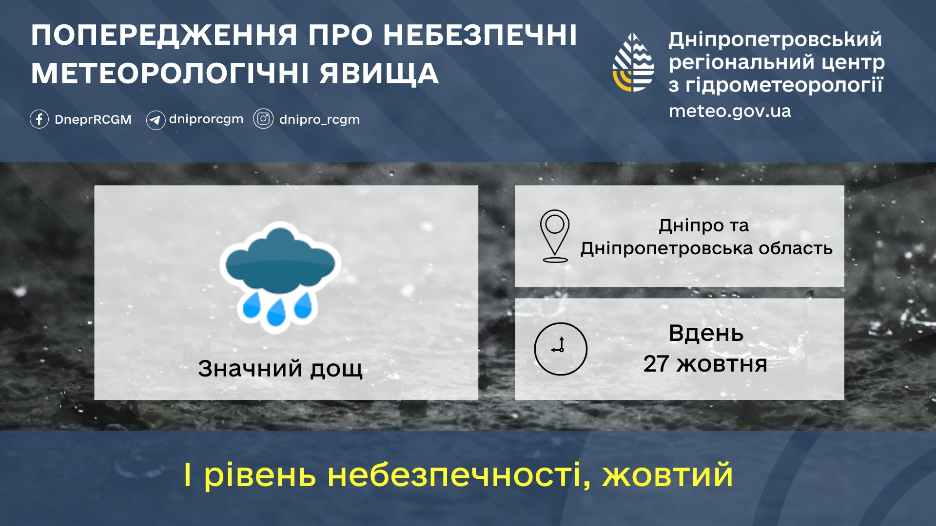 За інформацією Дніпропетровського регіонального центру з гідрометеорології, сьогодні, у понеділок, 27 жовтня, на території Кам’янського та Дніпропетровської області очікується значне погіршення погодних умов.