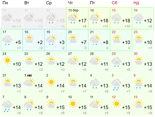 У Кам’янському значне похолодання також розпочнеться в ніч на неділю. Вже на початку наступного тижня денна температура знизиться до +2…5℃, проте до кінця тижня стабілізується на рівні +10℃ із подальшим підвищенням до +15℃ упродовж наступних 30 днів.