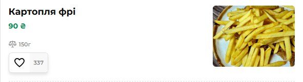 Заклад фаст-фуду у центрі Кам’янського представляє картоплю фрі у трьох розмірах. Стандартна порція коштує 80 грн за 200 грн. Відповідно 400 г коштує 160 грн та 600 грн – 240 грн. У наявності є і картопляні діпи, 90 грн за найменшу порцію.