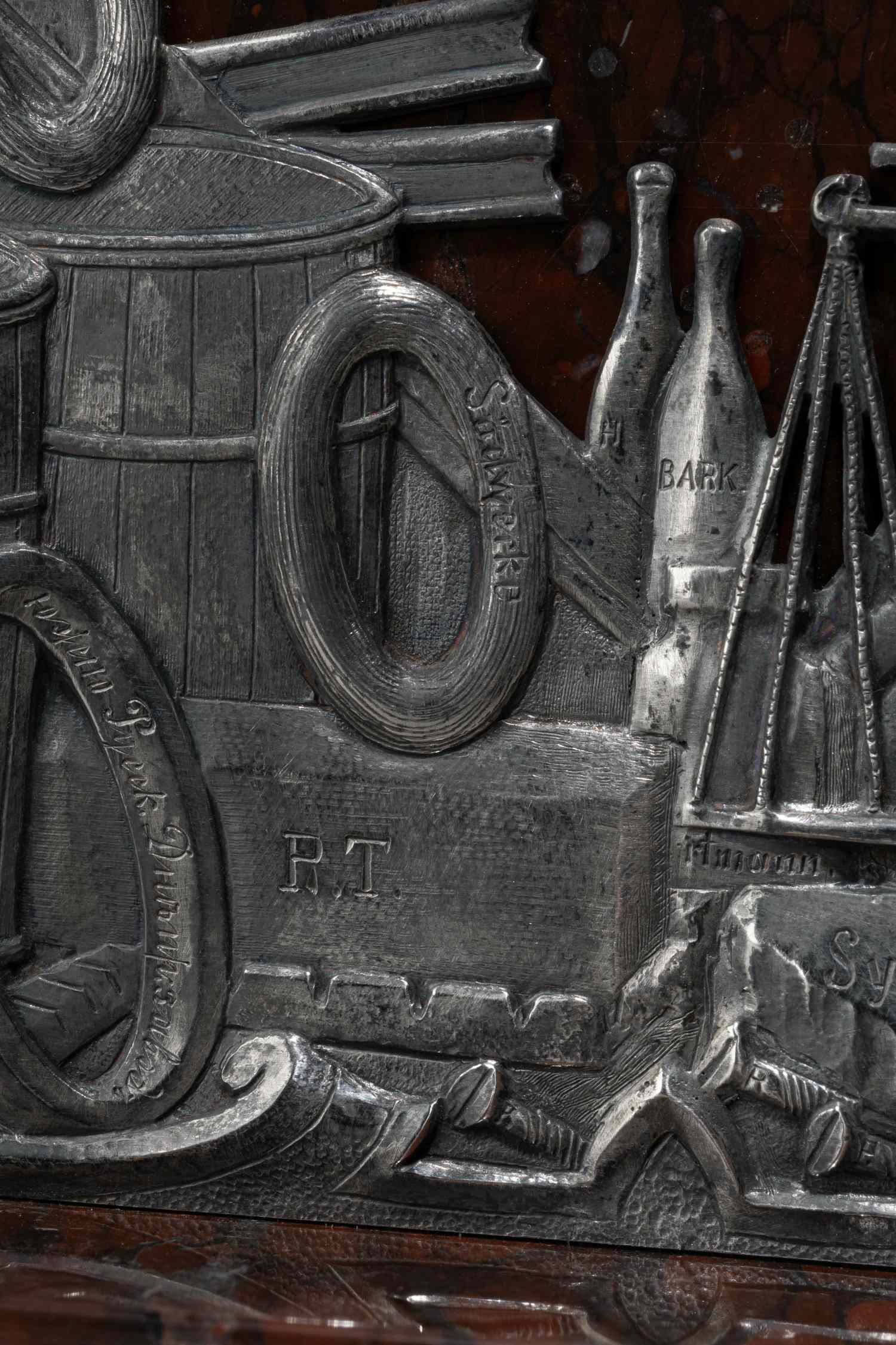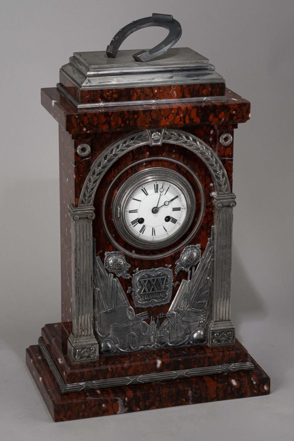 Це – подарунковий камінний годинник "Директору крупнейшего металлургического завода Европы" зі срібла та мармуру "гріотт", виготовлений у петербурзькій майстерні з виробництва срібно-карбованих виробів Андрія Брагіна в 1910 році. Брагін був одним із кращих столичних майстрів своєї справи, він працював і на замовлення імператорського двору.