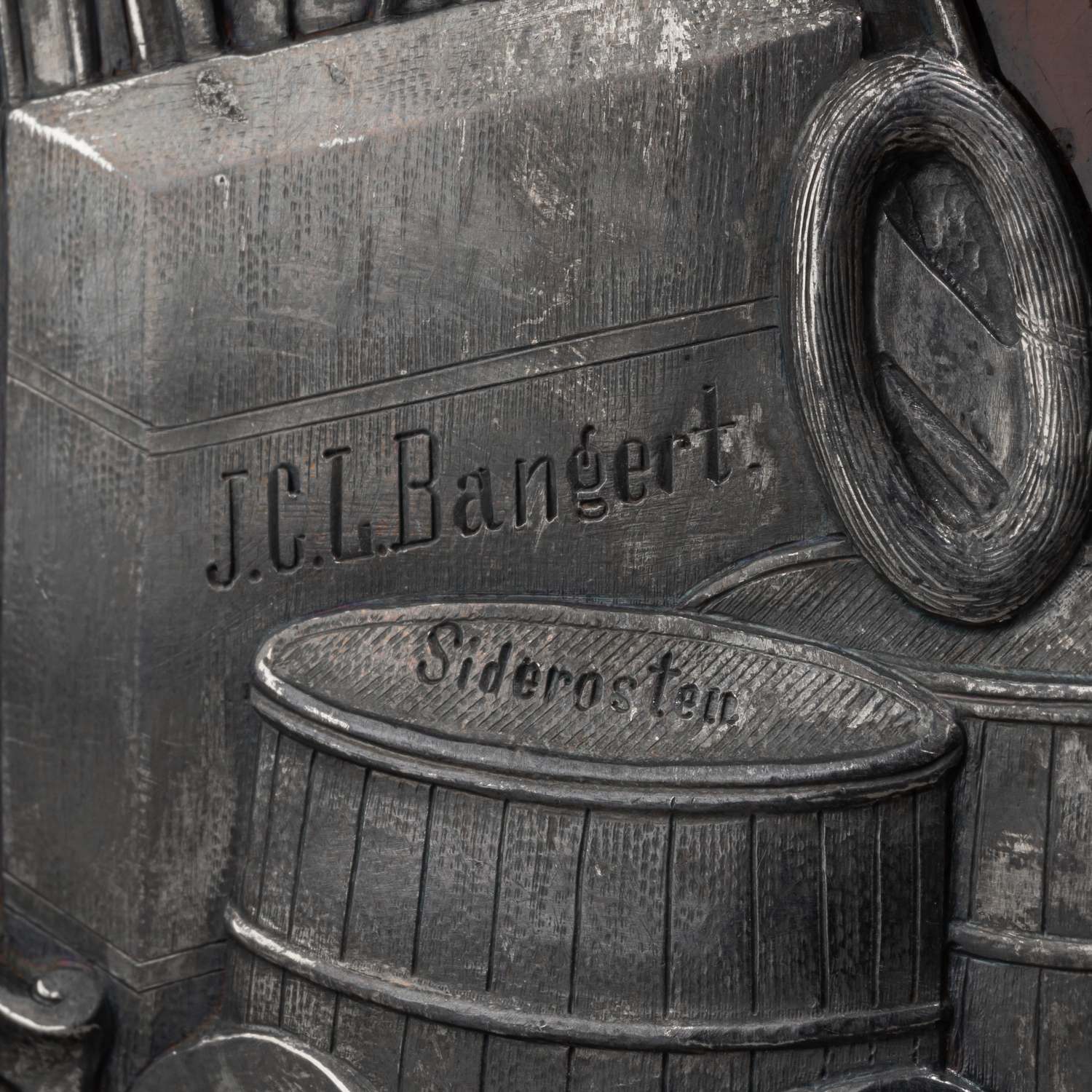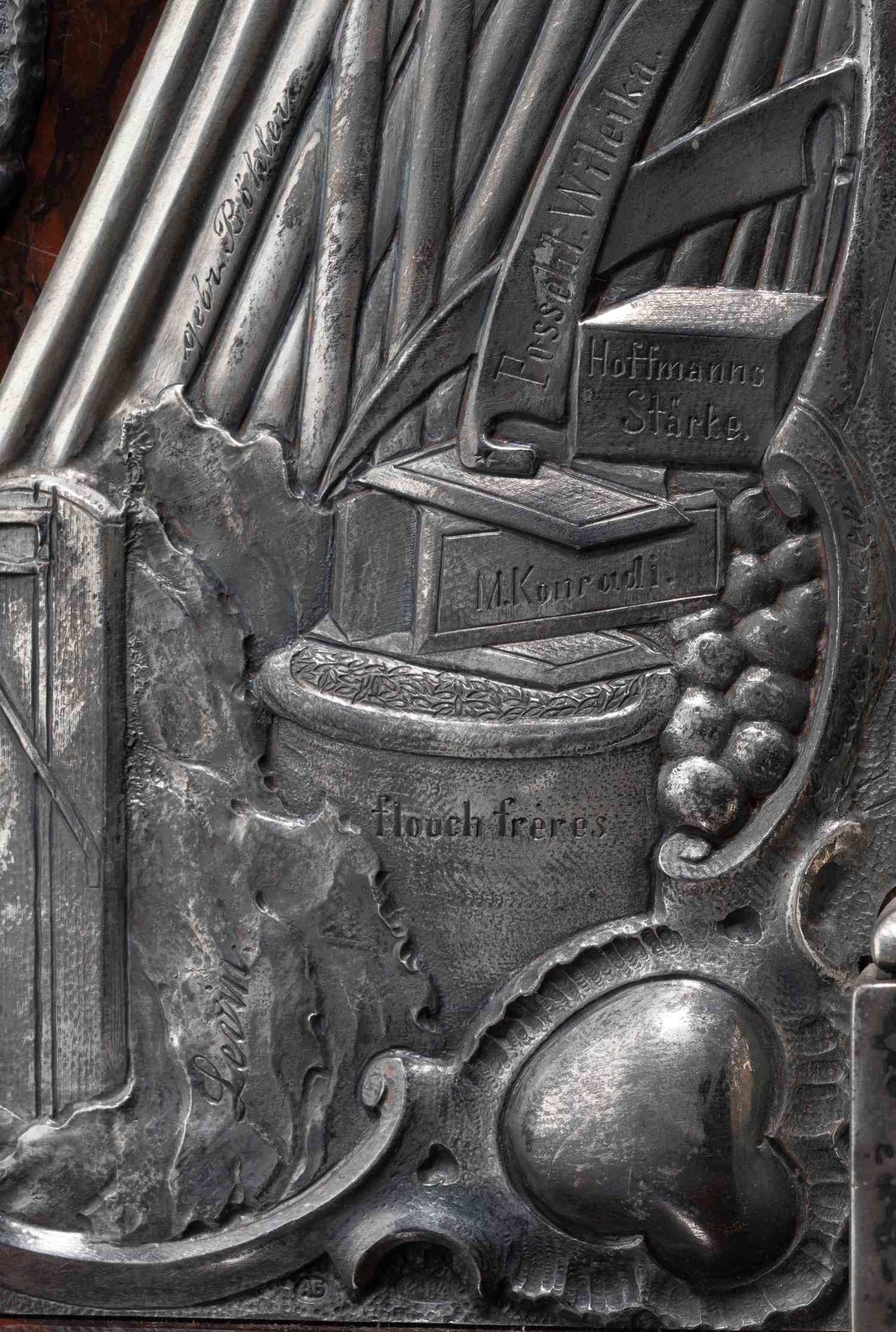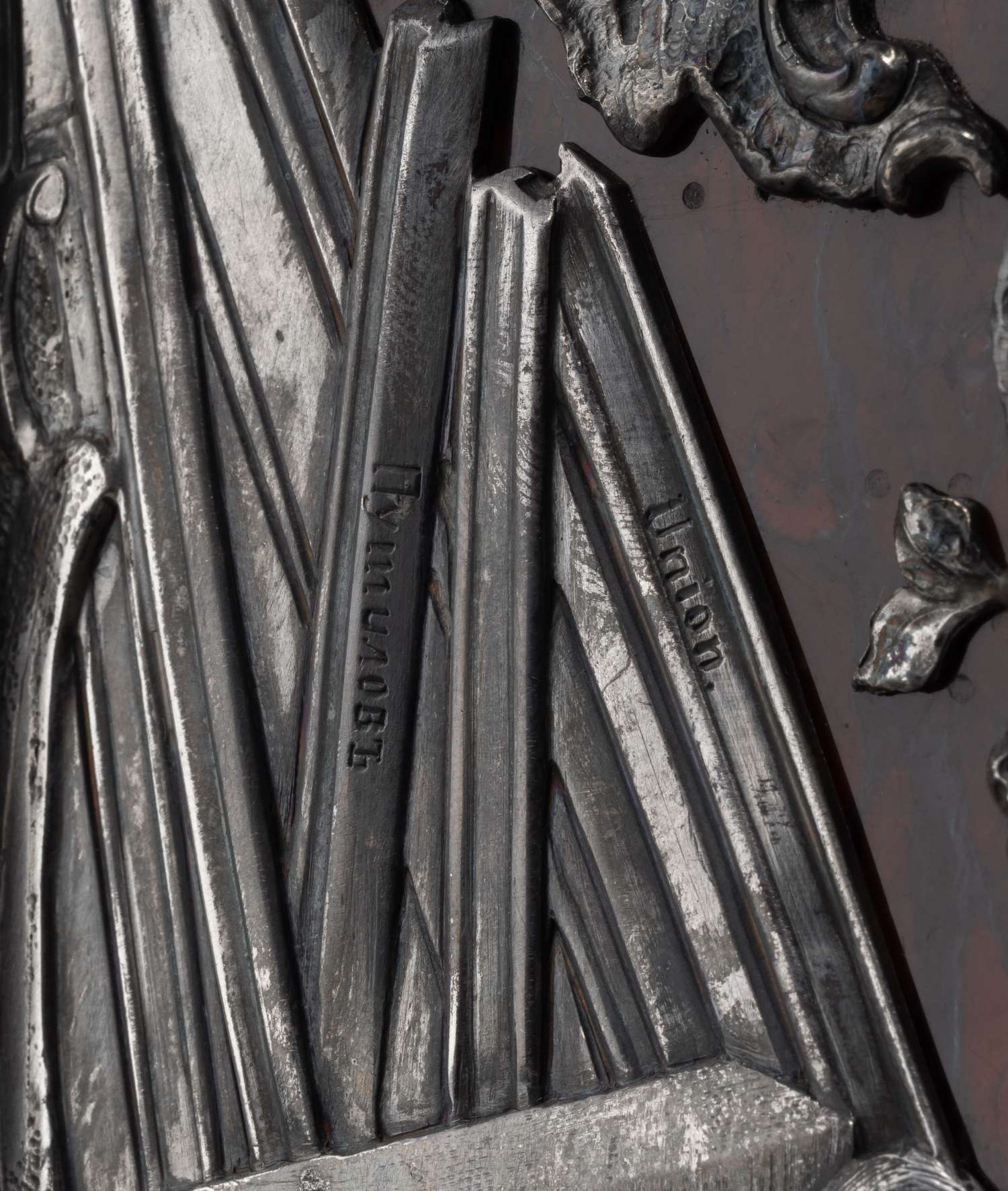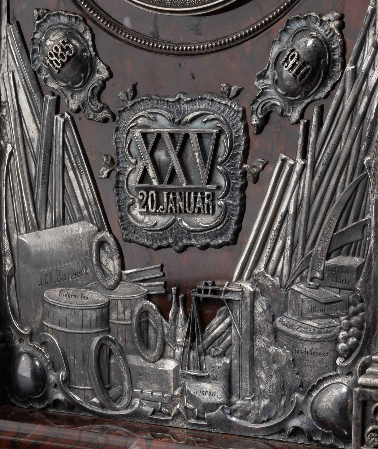 Під годинником у трьох срібних фігурних віньєтках зазначено дати "1885", "1910", "XXV 20 JANUAR". Також предмет містить гравіровані написи кирилицею та латиницею: "Южно русск. Днепр. Заводъ", "Путиловъ", "Sysran", "J.C.L. Bangert", "Hofma" Starke", "M.Keradi", "Posselit Wileika" тощо.