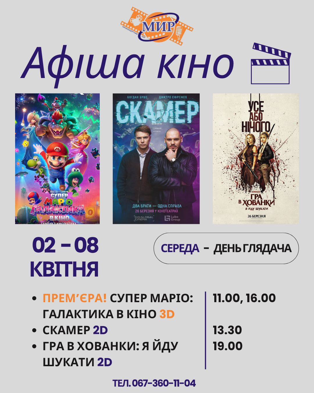Кінотиждень у кіноконцертному залі "МИР": Афіша з 02 по 08 квітня