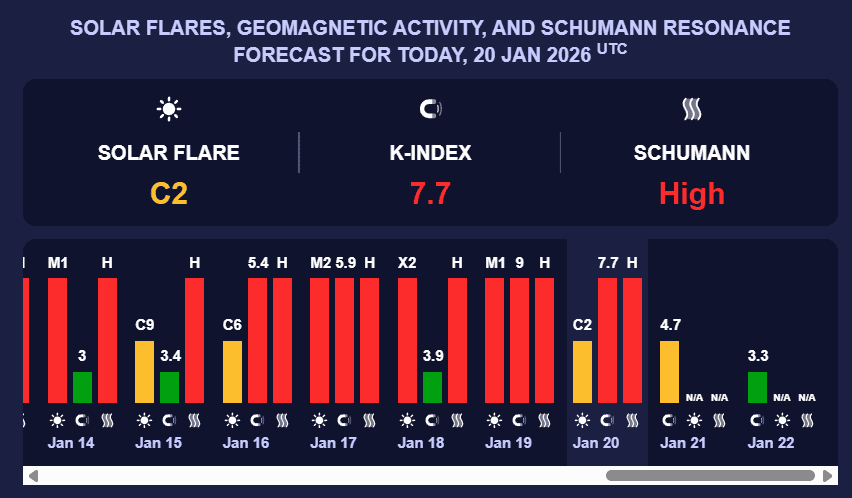 Сьогодні, у вівторок 20 січня, Земля опинилася під ударом надпотужної магнітної бурі. За даними сервісу Meteoagent та звітами Британської геологічної служби, рівень геомагнітної активності сягнув критичної позначки — К-індексу 7.7 (з 9 можливих).