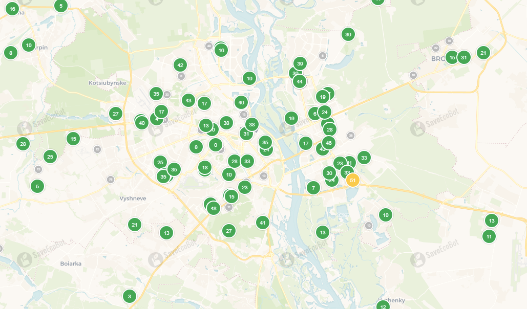У Києві теж порядок — майже вся столиця у зеленому спектрі. Лише в одному з районів мінімальне перевищення, яке не становить загрози для здоров’я.