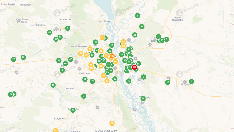 У Києві ситуація неоднозначна — більшість міста у зеленій зоні, але є багато перевищень жовтого та помаранчевого рівня. Також, зафіксовано перевищення червоного рівня, яке становить небезпеку навіть для здорових людей. Якщо відчуватимете дискомфорт під час дихання, використовуйте маски.