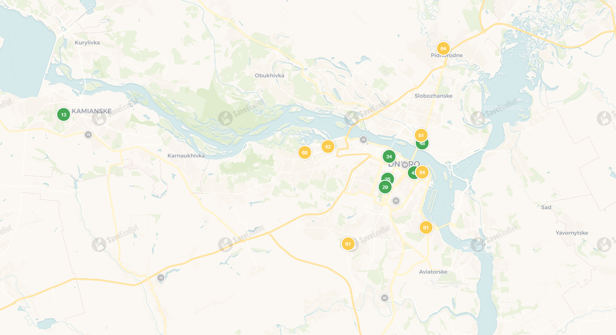 Сьогодні, 17 квітня 2025 року, за даними сервісу SaveEcoBot, у Кам’янському якість повітря в межах норми. А ось у Дніпрі половина міста у жовтій зоні, що вказує на перевищення норми — особливо чутливі люди можуть відчувати дискомфорт під час дихання.
