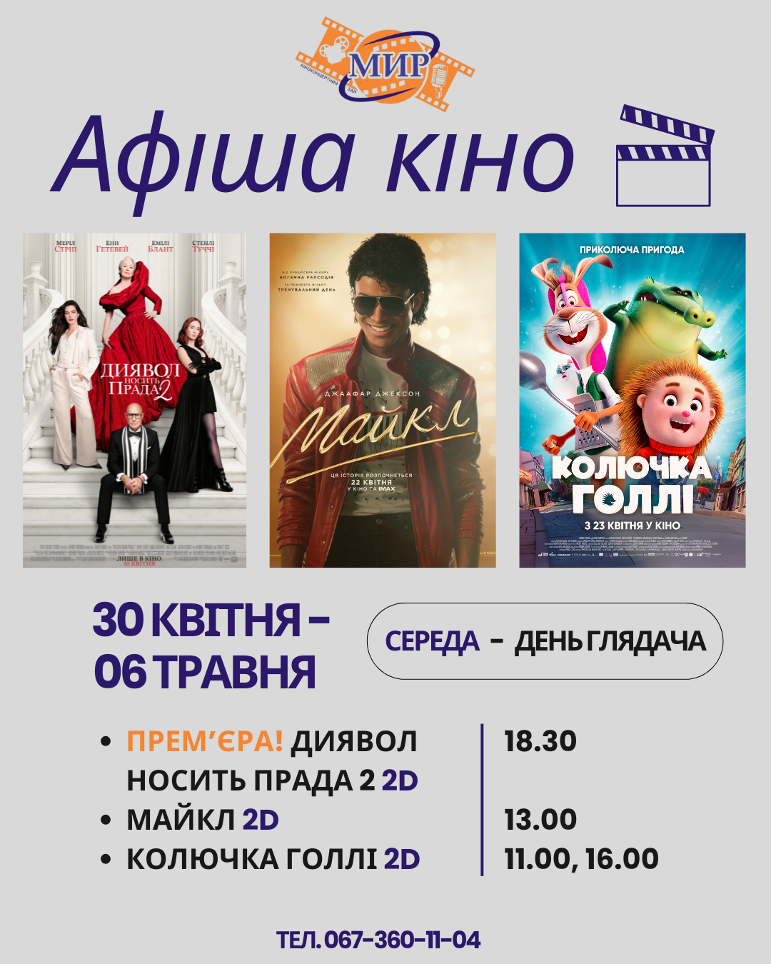 Розклад кіносеансів у кіноконцертному залі "МИР" з 30 квітня по 6 травня