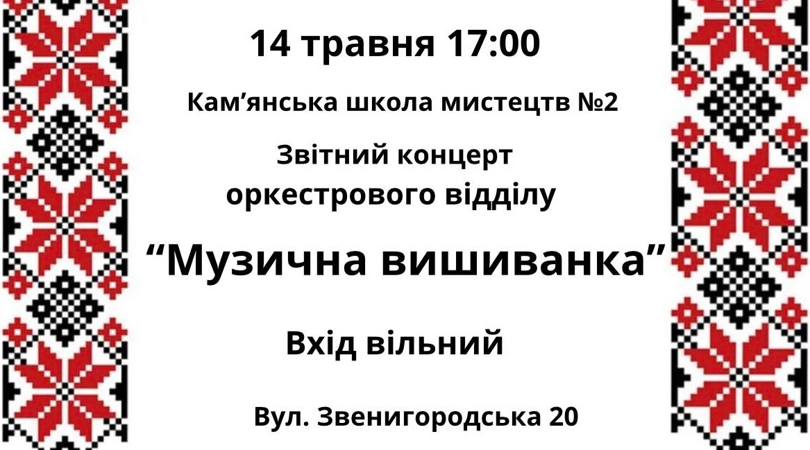 Кам’янська школа мистецтв №2 запрошує учнів та батьків на Звітний концерт оркестрового відділу "Музична вишиванка", присвячений Міжнародному Дню Вишиванки.