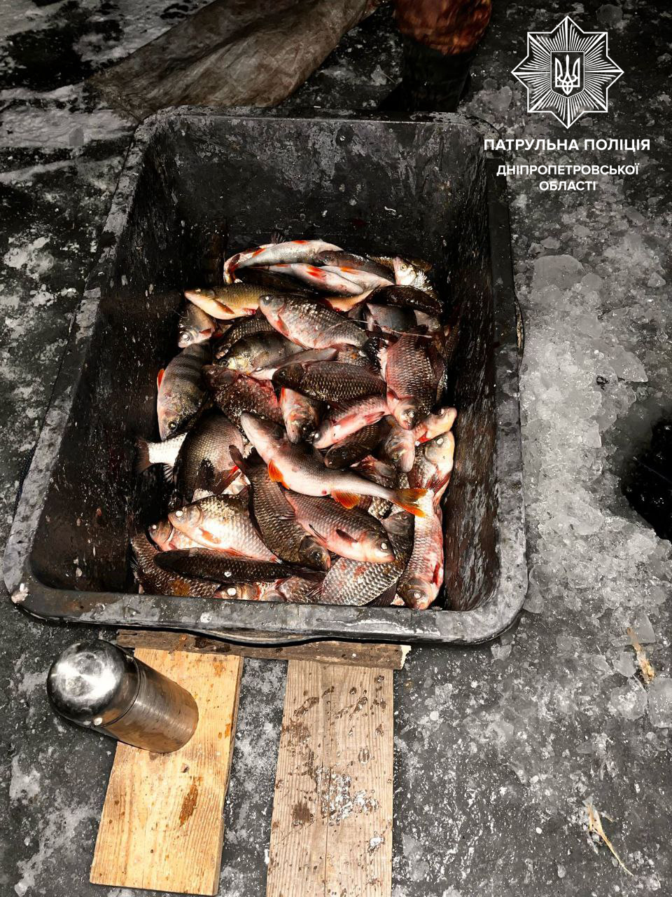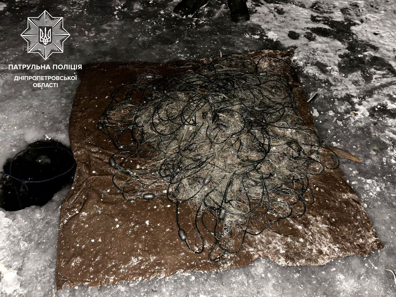 Патрульні роти з обслуговування водних об’єктів Кам’янського району виявили двох чоловіків, які рибалили на кризі річки Омельник, витягаючи щось із ополонки. Під час перевірки поліцейські з’ясували, що рибалки використовували сітку для незаконного вилову риби, а поруч на санях зберігали свіжу здобич. Дозволів на рибальство у них не виявилося.