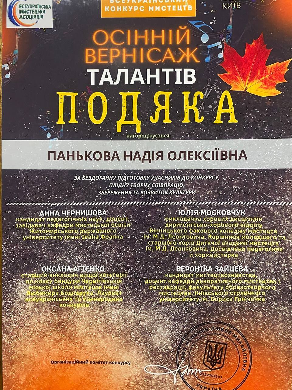 Викладачка Надія Панькова отримала подяку від організаторів за високий рівень підготовки учасниць, плідну співпрацю та значний внесок у розвиток культури.