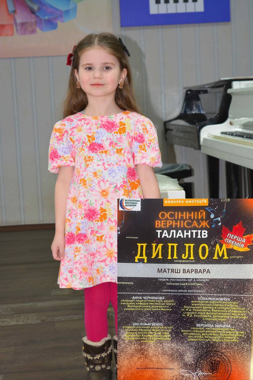Учениці фортепіанного відділу Кам’янської школи мистецтв №5 Аня Балберіна та Варя Матяш під керівництвом викладачки Надії Панькової здобули перше місце на Всеукраїнському конкурсі "Осінній Вернісаж Талантів", який відбувся 14 листопада 2025 року у дистанційному форматі (м. Київ).
