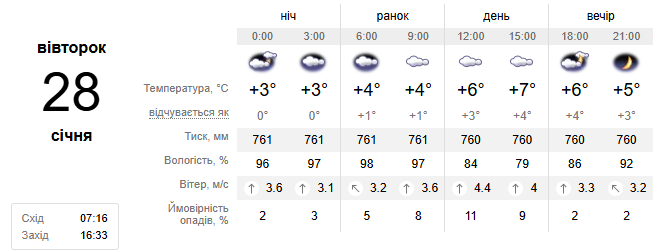 Температура коливатиметься від +3 до +7 градусів тепла. Вітер південний 4,4м/с.