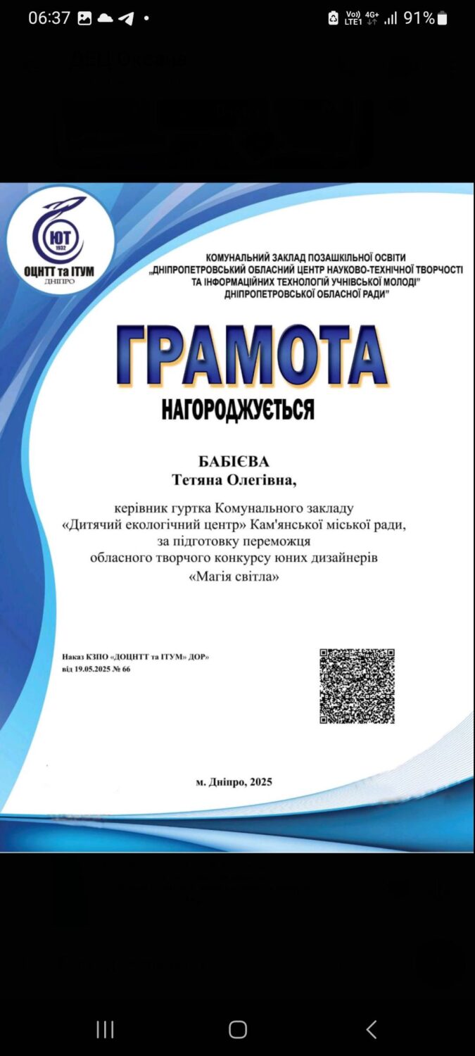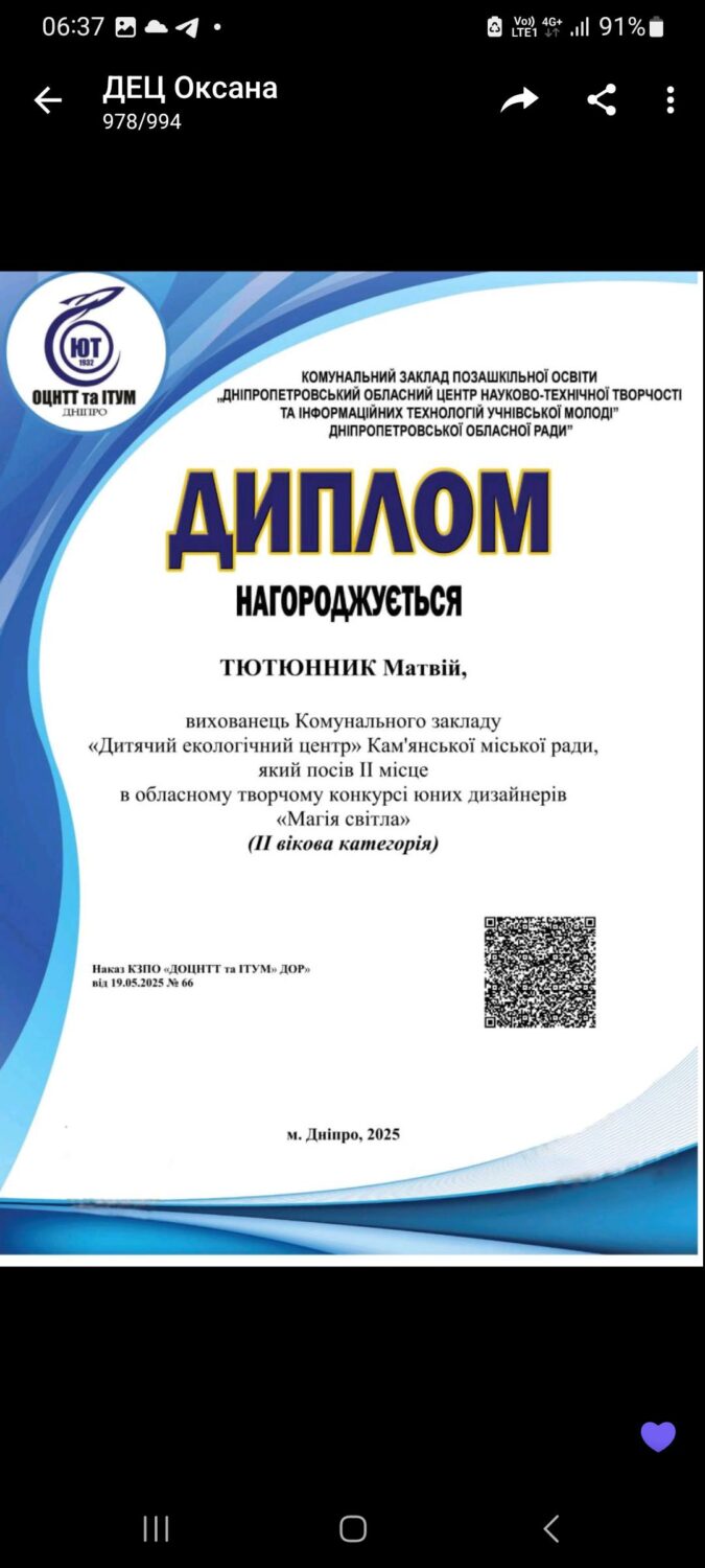 Вихованець гуртка "Ландшафтний дизайн з елементами комп’ютерного проєктування" у Дитячому екологічному центрі Кам’янського Матвій Тютюнник посів друге місце на обласному творчому конкурсі юних дизайнерів "Магія світла". Він відбувся під егідою Комунального закладу позашкільної освіти "Дніпропетровський обласний центр науково-технічної творчості та інформаційних технологій учнівської молоді" Дніпропетровської обласної ради.