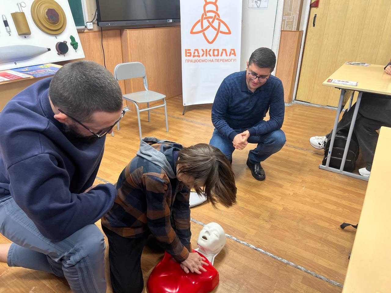 Найбільш захоплюючим став практичний блок, де школярі відпрацювали ключові навички: правильне накладання турнікетів, стабілізація постраждалого та командна робота у змодельованій надзвичайній ситуації.