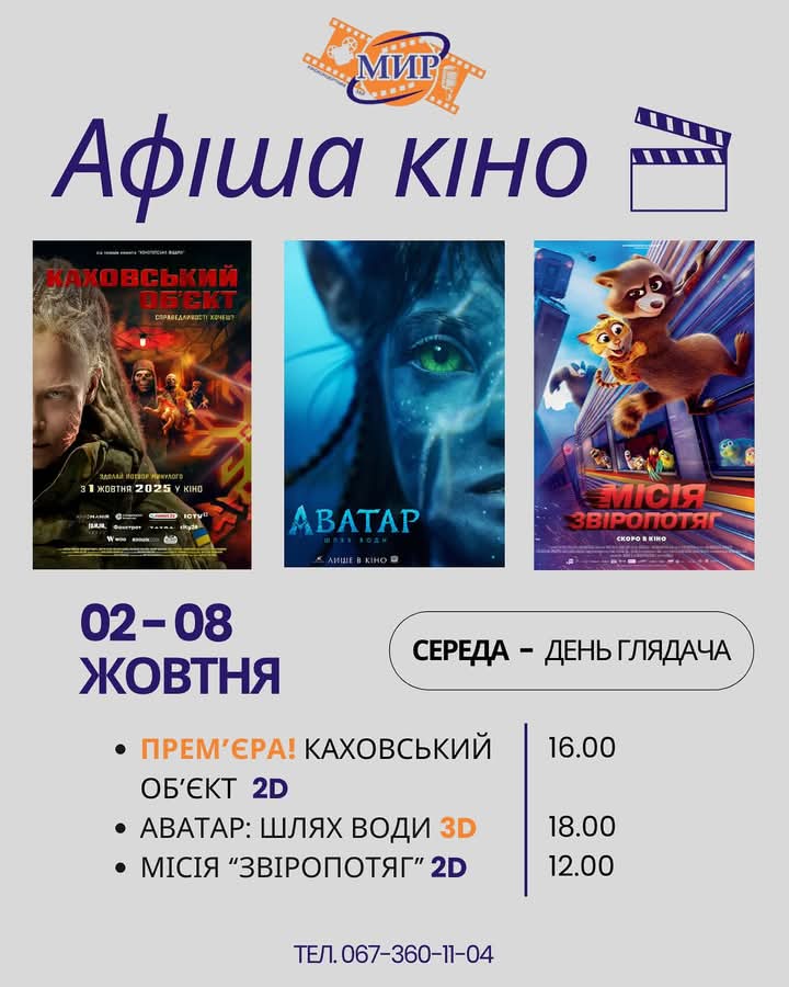 Афиша киноконцертного зала "МИР" с 2 по 8 октября