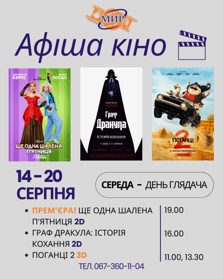 Очередная кинонеделя, с 14 по 20 августа, в Киноконцертном зале "МИР" порадует зрителей следующими фильмами....