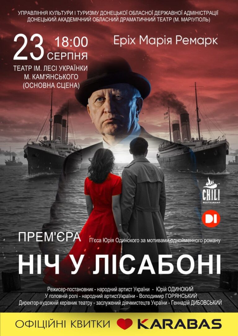 23 августа Донецкий театр (г. Мариуполь) покажет в Каменском спектакль "Ночь в Лиссабоне"