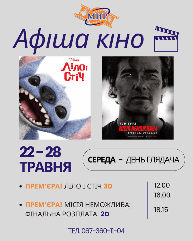 Киноконцертный зал "МИР", расположенный в левобережной части Каменского с 22 по 28 мая приглашает зрителей...