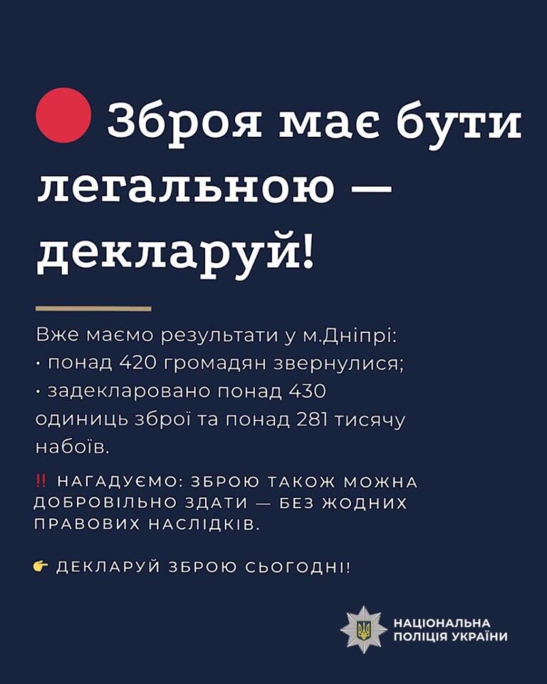 Полицейские Днепропетровщины напоминают о необходимости легализации оружия. С 25 ноября 2024 года все желающие могут...