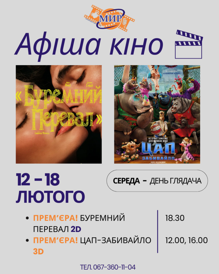 Экранизация классики и спортивный драйв: афиша киноконцертного зала "МИР" в Каменском с 12 по 18 февраля